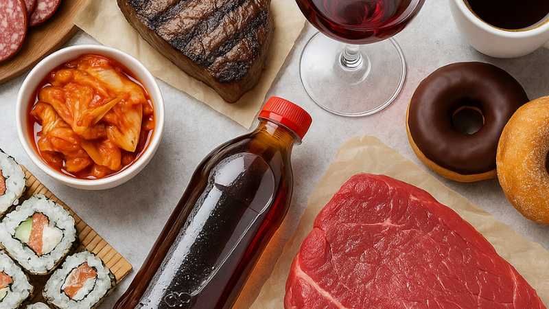 - ไส้กรอก เบคอน แฮม หรือเนื้อแดงจัด มักมีสาร ไนเตรต (Nitrate) และ ไขมันอิ่มตัว สูง ซึ่งอาจกระตุ้นให้ร่างกายเกิดการอักเสบ หรือทำให้ระบบย่อยอาหารทำงานหนักเกินไป